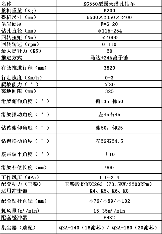 KG550型露天潛孔鉆車是開山重工最新研發(fā)的光伏、爆破兩用履帶式鉆機(jī),液壓系統(tǒng)全面升級,配備大扭力回轉(zhuǎn)器,鉆孔直徑可達(dá)254mm。產(chǎn)品性能穩(wěn)定,使用壽命長,可廣泛使用在較大孔徑光伏基樁、水電工程、露天采礦、道路修建,隧道修建等施工工地鉆鑿爆破孔作業(yè)。